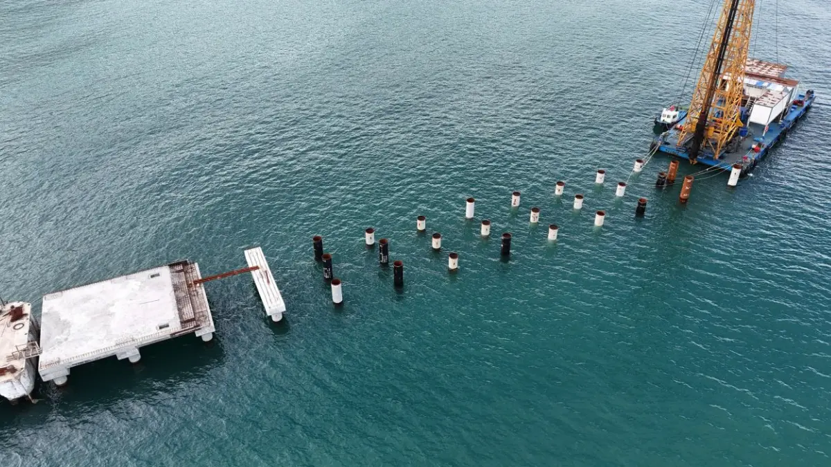 Ekipler, 270 metrelik mevcut alanda kazık güçlendirme çalışmalarına hazırlanırken, yeni yapılacak 140 metrelik bölümde kazık çakma işlemlerini sürdürüyor. Projede planlanan 72 kazıktan 39’u tamamlandı. Yeni iskele alanında kazık imalatları devam ederken, mevcut rıhtımın güçlendirilmesi için çelik kazıkların sahaya nakli sağlanarak kaynak ve hazırlık çalışmalarına başlandı.