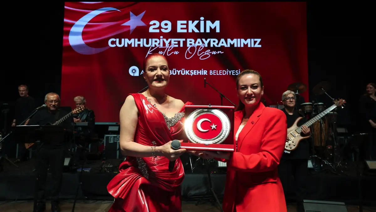 Başkan Vekili Büşra Özdemir’in konuşmasının ardından pop müziğin güçlü sesi Candan Erçetin sahneye çıktı. Elinde Türk bayrağı ile sahneye çıkan Erçetin konsere meydanı dolduran Antalyalılar ile “Memleketim” şarkısını seslendirerek başladı. Candan Erçetin’in seslendirdiği şarkılara eşlik eden Antalyalılar Cumhuriyetin 102. yılını coşkuyla kutladı. Coşkunun bir an olsun dinmediği konserde Candan Erçetin de Cumhuriyet Bayramı’nı Antalyalılar ile kutluyor olmaktan duyduğu mutluluğu dile getirdi. Başkan Vekili Özdemir Candan Erçetin’e Antalyalılar adına teşekkür ederek, üzerinde Türk bayrağı olan bir plaket ve çiçek takdim etti. Erçetin konser boyunca şarkılarını Antalyalılar ile birlikte seslendirdi.