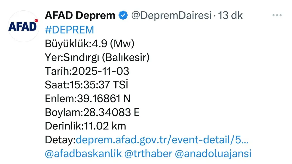 Afet ve Acil Durum Yönetimi Başkanlığının (AFAD) internet sitesinde yer alan bilgiye göre, merkez üssü Sındırgı olan 4,9 büyüklüğünde sarsıntı kaydedildiğini duyurdu. İstanbul ve çevre illerde de hissedilen deprem, ilk belirlemelere göre herhangi bir olumsuzluğa yol açmadı.