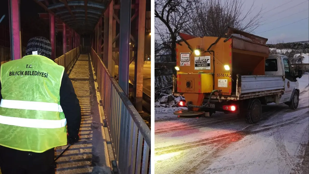 Vatandaş ve araç sürücülerinin iş ve okullarına rahatlıkla gitmeleri için gece boyunca küreme ve tuzlama çalışması yapan ekipler ayrıca köprü, kaldırım ve geçiş noktalarında solüsyonlama çalışması gerçekleştirdi. Bilecik Meteoroloji Müdürlüğü ile iletişim halinde olan ekipler, kış mevsimi boyunca olası olumsuz hava koşulları için 7 gün 24 saat esasına göre çalışmalarını sürdürecek.