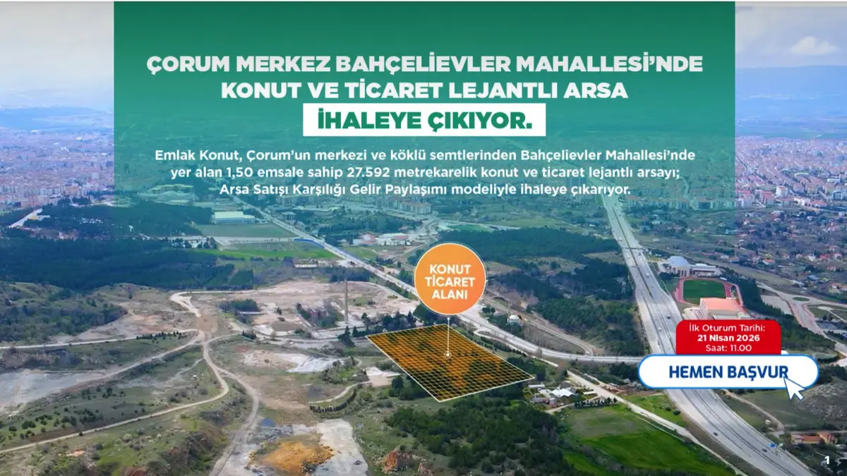 Çorum’daki eski çimento fabrikası arazisinde, Çorum Belediyesi Beltaş A.Ş. ile Emlak Konut GYO iş birliğinde hayata geçirilecek konut ve ticaret alanı projesi için ihale tarihi açıklandı. Çevre, Şehircilik ve İklim Değişikliği Bakanı Murat Kurum’un Çorum ziyareti sırasında Nisan ayında yapılacağını açıkladığı çimento fabrikası arazisine yönelik ticaret ve konut projesinde süreç resmiyet kazandı. Emlak Konut GYO tarafından yapılan açıklamayla ihalenin tarihi netleşti. Emlak Konut Gayrimenkul Yatırım Ortaklığı, Çorum Merkez Bahçelievler’de bulunan eski çimento fabrikası arazisinde hayata geçirilecek proje için “Arsa Satışı Karşılığı Gelir Paylaşımı İşi” ihalesinin 1. oturumunun 21 Nisan 2026 Salı günü saat 11.00’de gerçekleştirileceğini duyurdu.