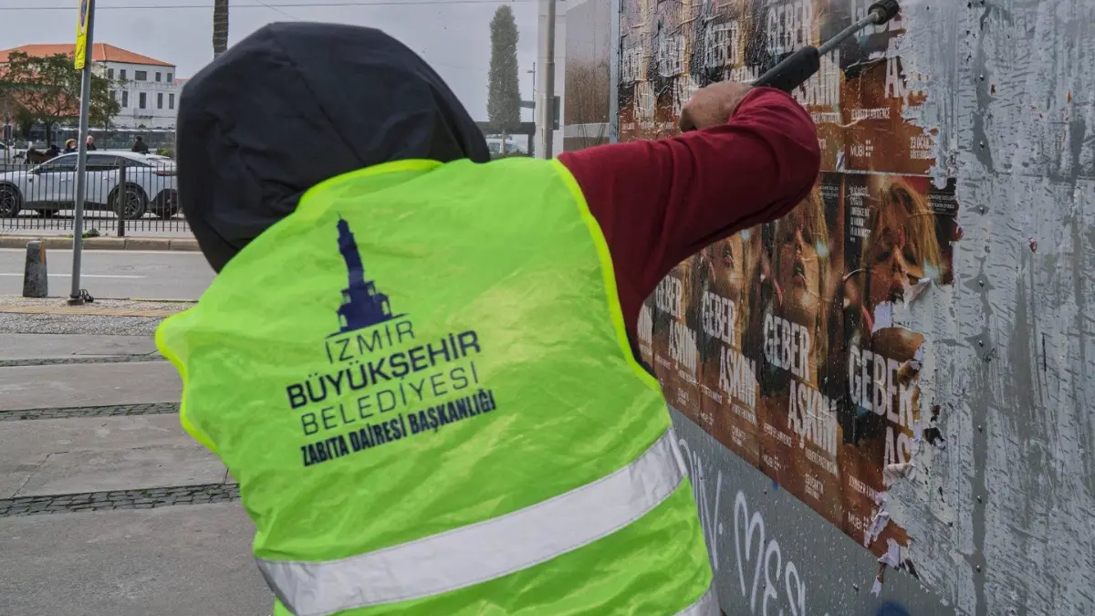İzmir Büyükşehir Belediyesi Zabıta Dairesi Başkanlığı, kent estetiğini korumak ve kamusal alanların izinsiz kullanımını önlemek amacıyla izinsiz ilan ve reklamlara yönelik denetim ve kaldırma çalışmalarını sürdürüyor. Ekipler, belediye sınırları içinde elektrik direkleri, duvarlar, üst geçitler ve kamuya ait alanlara izinsiz asılan afişleri tek tek söküyor.