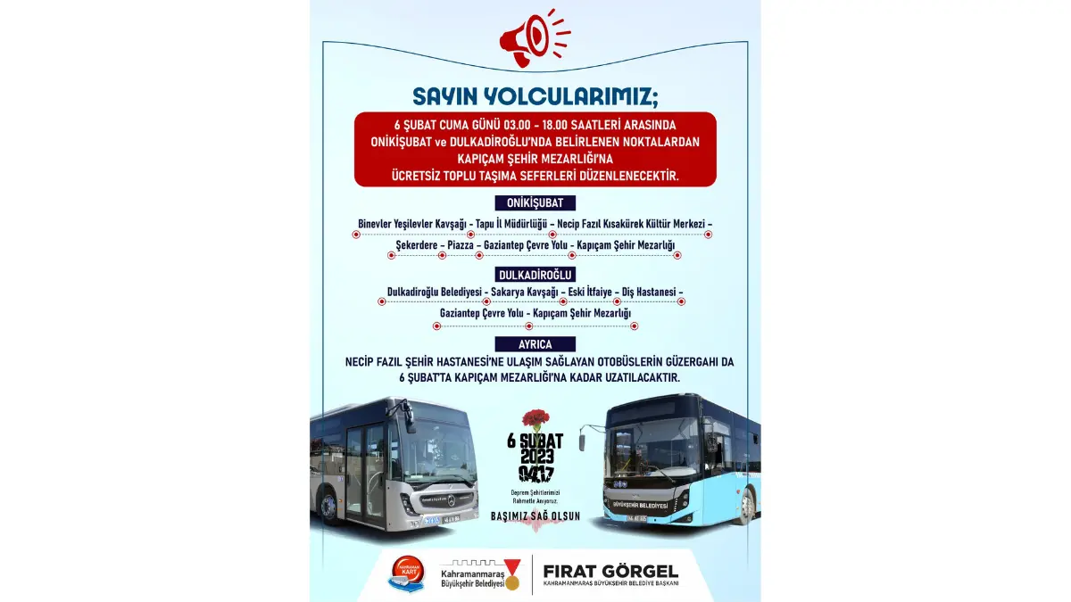 Kahramanmaraş Büyükşehir Belediyesi, 6 Şubat’ta kaybettiklerini mezarı başında ziyaret etmek isteyen hemşehrileri için ücretsiz otobüs hattının detaylarını paylaştı.