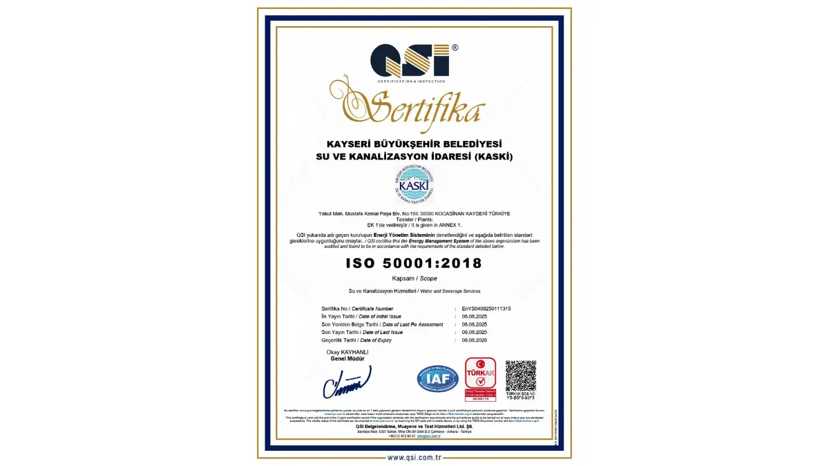 KASKİ, enerji verimliliğini artırmaya yönelik çalışmaları sayesinde ISO 50001:2018 ‘Enerji Yönetim Sistemi Sertifikası’ almaya hak kazandı. KASKİ aldığı bu sertifika sayesinde enerji kaynaklarının daha bilinçli kullanıldığını, israfın önüne geçildiğini ve çevre dostu uygulamaların benimsendiğini göstermiş oldu.