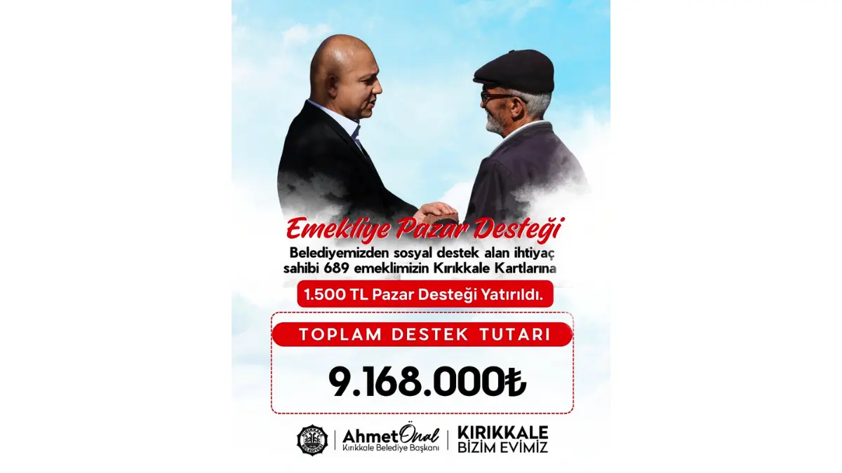 Kırıkkale Belediye Başkanı Ahmet Önal, konuya ilişkin yaptığı açıklamada, “Belediyemizden sosyal destek alan emekli vatandaşlarımıza yardımcı olabilmek amacıyla ‘Emekli Pazar Desteği’ uygulamasını hayata geçirdik. Aylık bin 500 TL’lik bu destekle temel gıda ihtiyaçlarını daha rahat karşılamalarını hedefliyoruz” dedi.