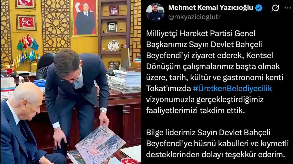 Başkanlık makamında dinleme cihazı çıkan ve Tokat iç siyasetinde çalkantılı bir süreçten geçen Tokat Belediye Başkanı Mehmet Kemal Yazıcıoğlu, yaşanan tüm olumsuzluğa rağmen çalışmaya devam ediyor. Tokat’ın kentsel dönüşümünü gündeminin başlarında tutan Başkan Yazıcoğlu, partisi MHP’nin Genel Başkanı Devlet Bahçeli’yi makamında ziyaret etti. İkilinin bir araya geldiği görüşmede, Başkan Yazıcıoğlu, çalışmalara dair son durumu ve projeleri Genel Başkan Bahçeli’ye arz etti.