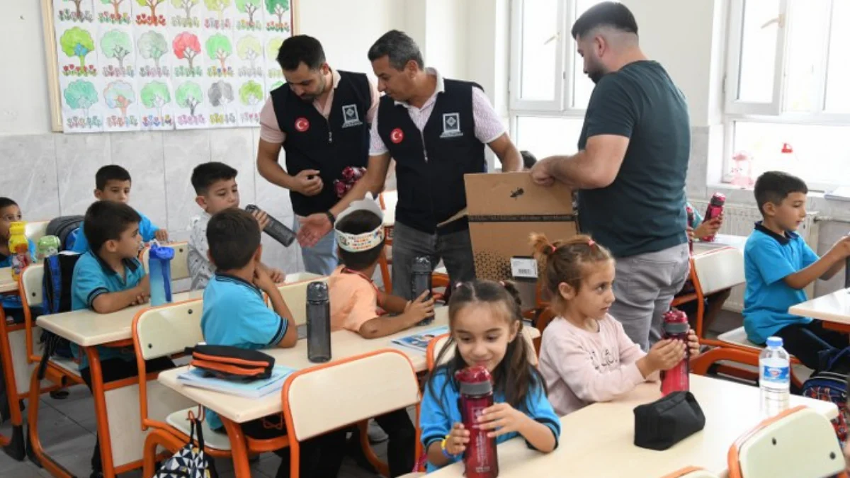 İklim Değişikliği ve Sıfır Atık Müdürlüğü tarafından “Geleceğimiz, sevgili çocuklarımızın omuzlarında yükselecek” anlayışıyla yürütülen proje kapsamında öğrencilere dağıtılan sulukların üzerinde “Sıfır Atık”, “Sağlık için su için. Pet şişe atığını azaltalım. Bu şişeden her su içtiğinde doğaya atık bırakmadığın için teşekkürler” ifadeleri yer aldı.