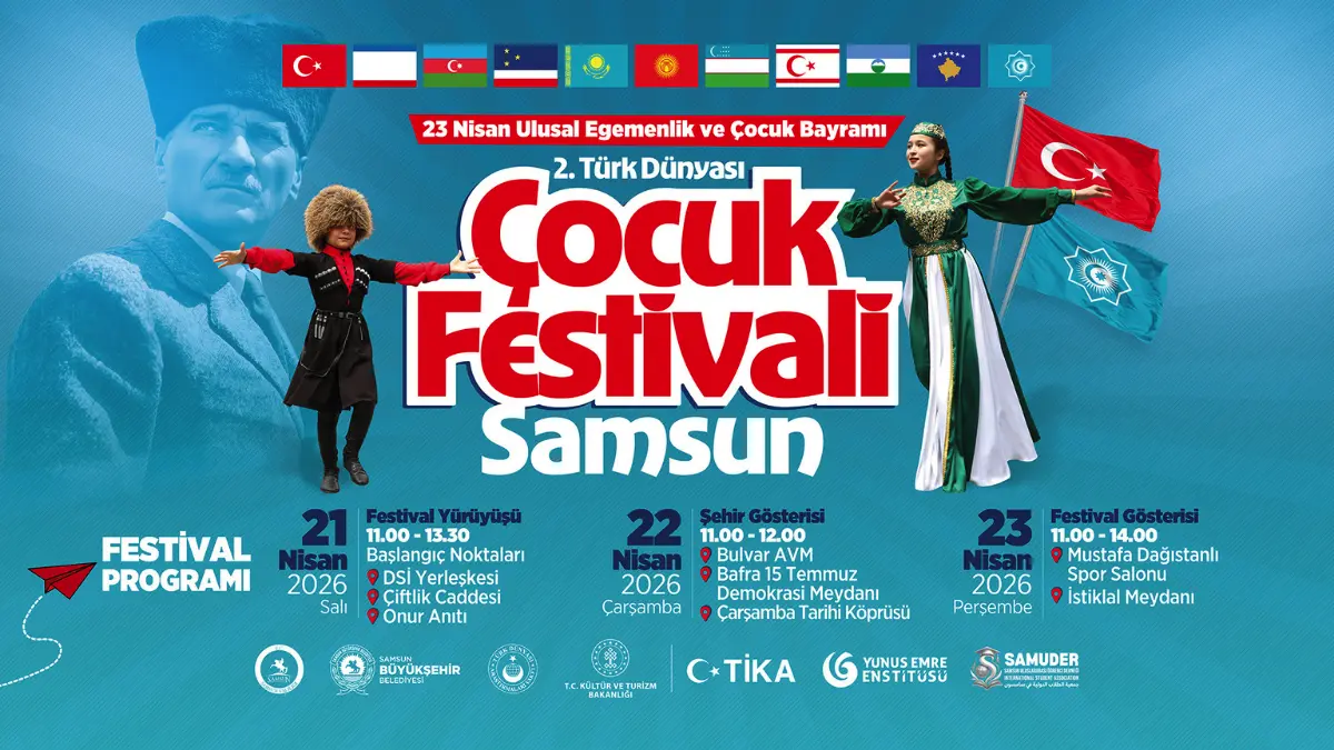 Samsun Büyükşehir Belediyesi tarafından düzenlenen 2. Samsun Türk Dünyası Çocuk Festivali, 19-25 Nisan 2026 tarihleri arasında gerçekleştirilecek. Samsun Valiliği, Samsun İl Milli Eğitim Müdürlüğü, Türk Dünyası Araştırmaları Vakfı, Yunus Emre Enstitüsü, Türk İş Birliği ve Koordinasyon Ajansı Başkanlığı (TİKA) ve Gençlik ve Spor İl Müdürlüğü olmak üzere birçok kurum ve kuruluşun destekleriyle hayata geçirilen festival, Türk Dünyası’nın dört bir yanından gelen çocukları aynı çatı altında buluşturacak.
